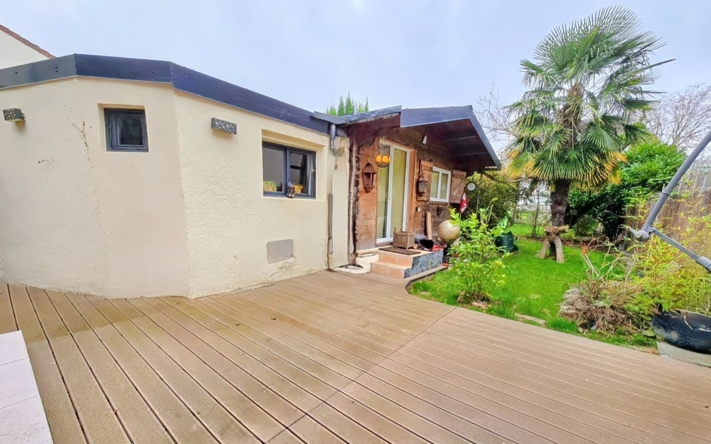 À l’extérieur, une loggia indépendante prolonge harmonieusement les espaces de vie. Le jardin paysager d’environ 500 m², facile d’entretien, invite à la détente et aux moments de réception.