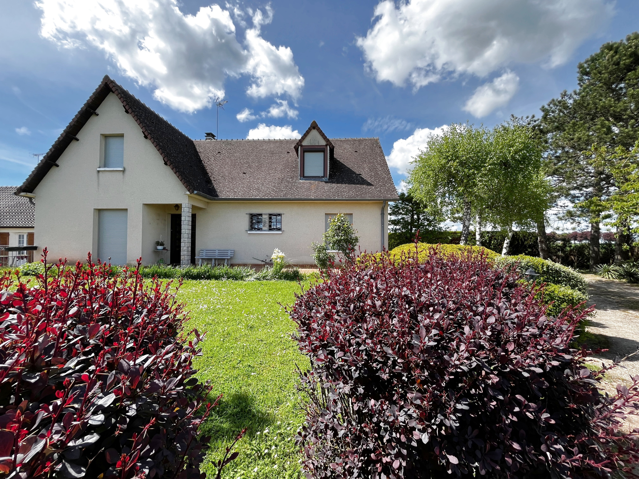 Le jardin arboré, parfaitement entretenu, offre un cadre verdoyant et paisible. Deux grands garages ainsi qu’un second garage et une dépendance complètent l’extérieur.