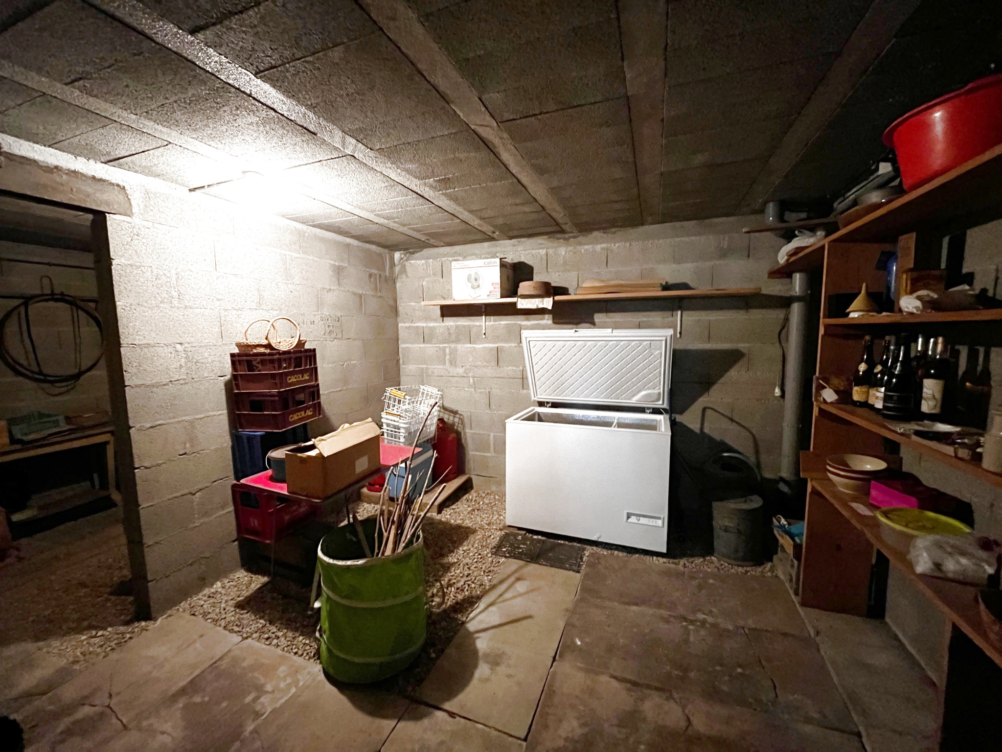 Le sous-sol total représente une réelle opportunité d’exploitation : cuisine secondaire, deux caves, pièce de rangement et espace garage offrent de nombreuses possibilités pour les amateurs de bricolage, de stockage ou pour envisager un aménagement futur.