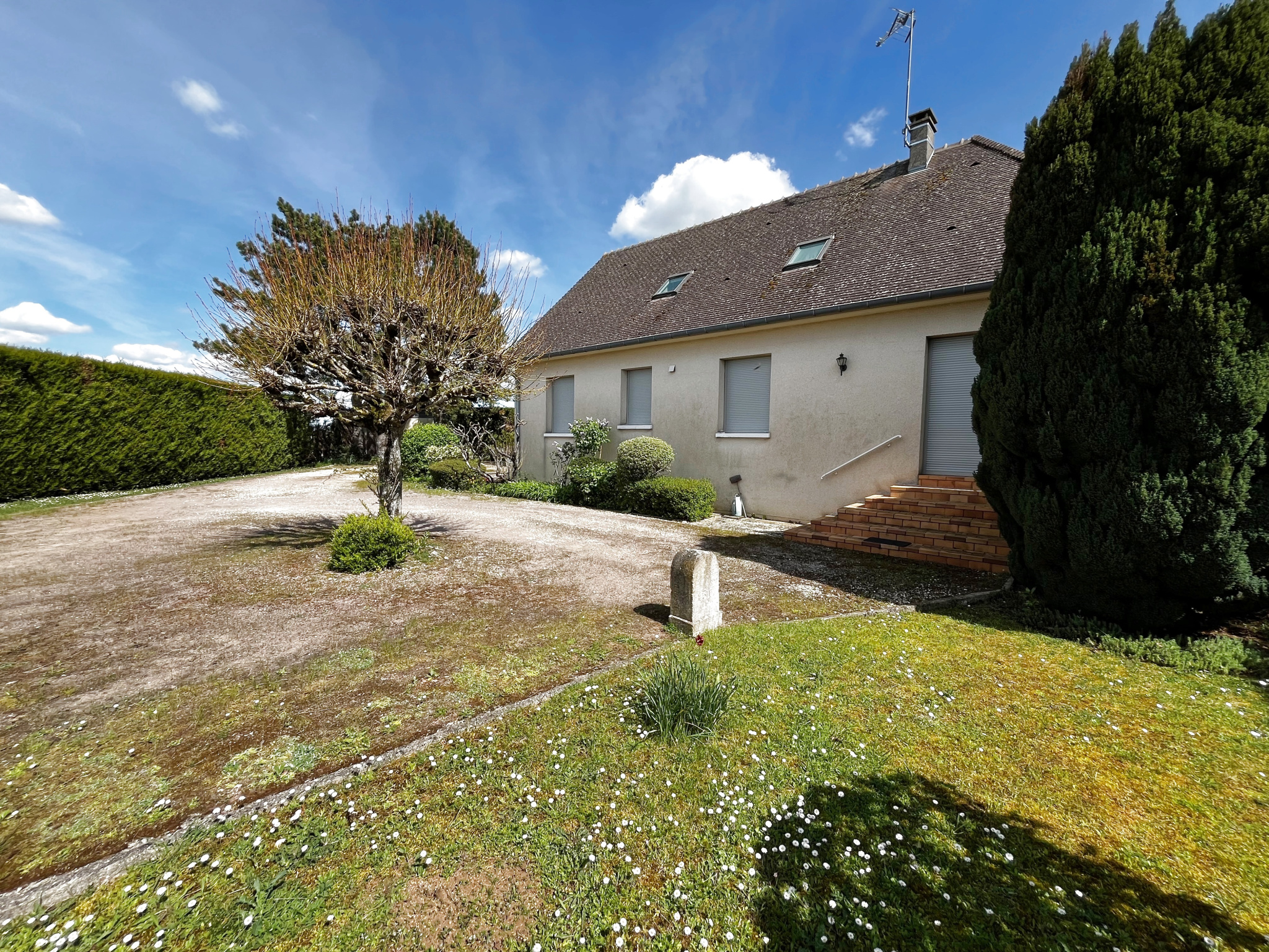 Vous apprécierez la vie de plain-pied, un atout très demandé, avec deux chambres, une salle d’eau, un WC indépendant, ainsi qu’une entrée donnant sur un salon-séjour lumineux, prolongé par une salle à manger et une cuisine de style d’époque. À l’étage, trois chambres supplémentaires, une salle d’eau ainsi qu’un grenier permettent d’accueillir famille, invités ou espaces de travail selon les besoins.